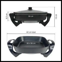Medidas totales de la sartén: 15 centímetros de alto, 42 centímetros de ancho y 6,5 centímetros de profundidad.